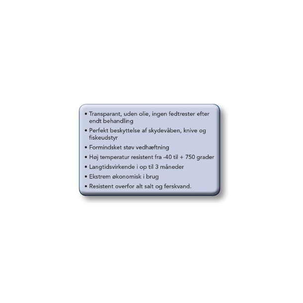 For at våbnet kan tage bedst muligt imod coatingen er det vigtigt at alt tidligere olie og smøremiddel er væk. Det gøres nemt med denne degreaser, som hurtigt fjerner fedt, olie og smøremidler fra alle overflader. Degreaseren er velegnet til alle typer våben, f.eks. rifler, pistoler, haglgevær og knive. Påvirker ikke plast og gummi. - Coating: