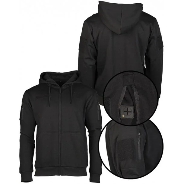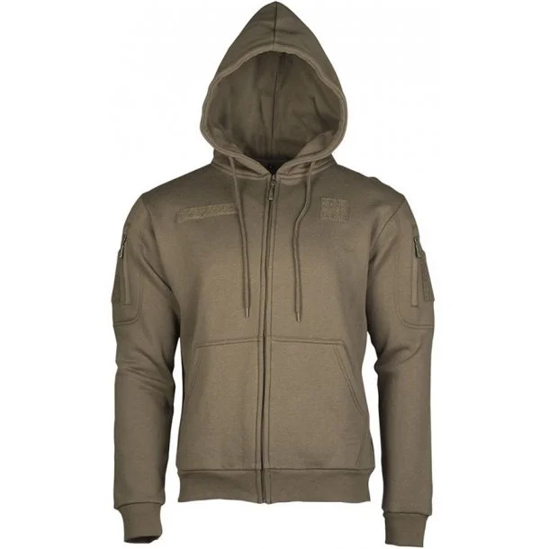 Sporty hoodie med lynlås. Hætten kan strammes ind og justeres. To velcro-områder ved brystet hvor det er muligt at påsætte patches og lommer i begge sider.